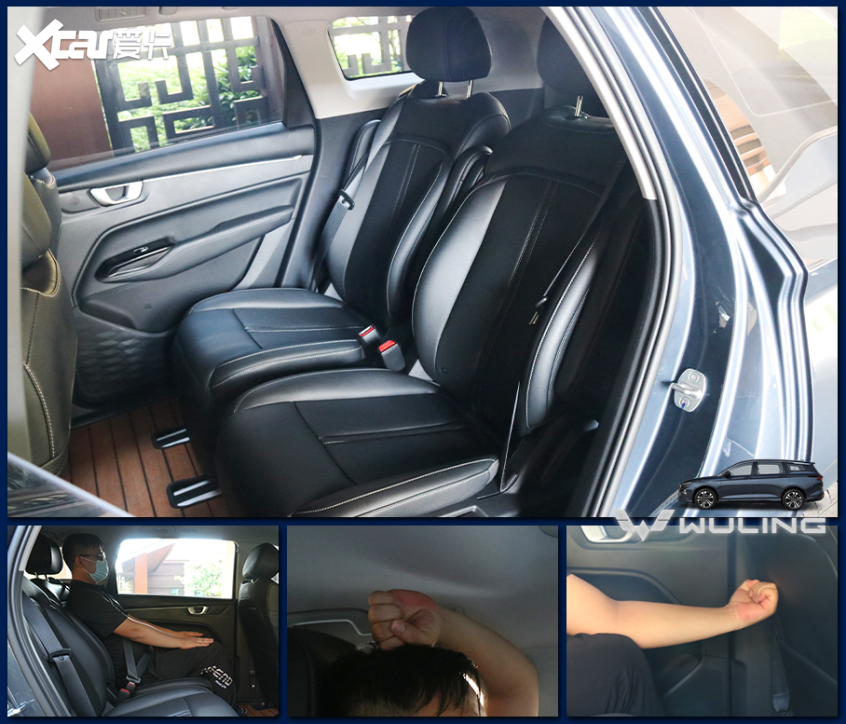 第二排座椅支持手动调节,包括座椅前后、左右、靠背角度、腿托调节。其中滑轨长度达到560毫米,当第三排座椅立起来时,腿部空间约有一臂距离,非常可观。