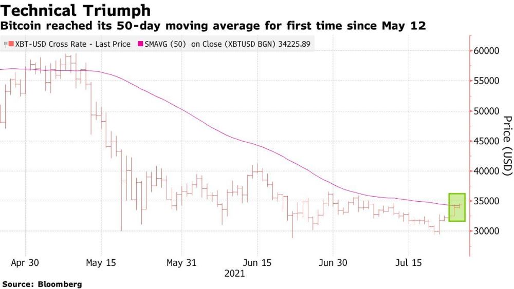 上周六,自5月12日以来这一最大的加密货币比特币首次升至50日均线上方。周日再次上涨,连续五个交易日实现上涨,最高达到34609美元。截至发稿,比特币的最新价格为34686美元。