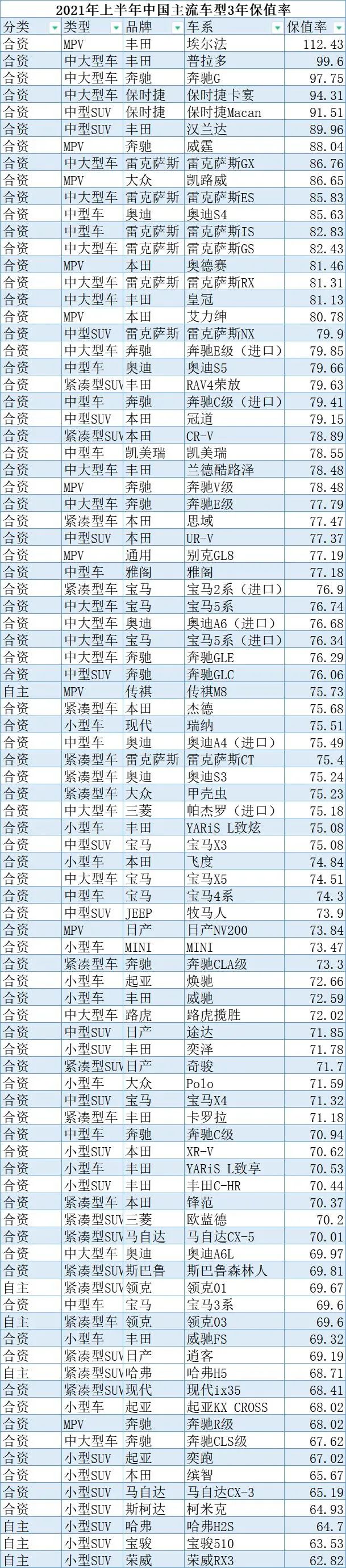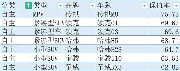 在汽车流通协会公布的90款车型中,仅有7款自主品牌车型上榜,其中传祺M8以75.73%的三年保值率在自主燃油车中排名第一,接下来是领克01、领克03、哈弗H5、哈弗H2S、宝骏510和荣威RX3。