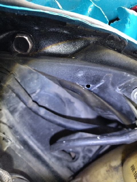 赶紧看了前纵梁,911的纵梁原本应该是端端正正表面光溜溜的,但右边的纵梁已经像覆盖上一层厚厚的大雪了!这是做过钣金烧焊的样子!