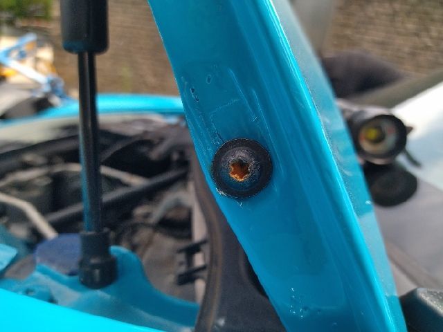 前机盖改成碳纤维材料的了,所以铰链螺丝有过拆卸。是不是事故之后改的呢?这个值得商榷!毕竟机盖下面是空的,没有支撑结构,受撞击的时候非常容易变形损坏。