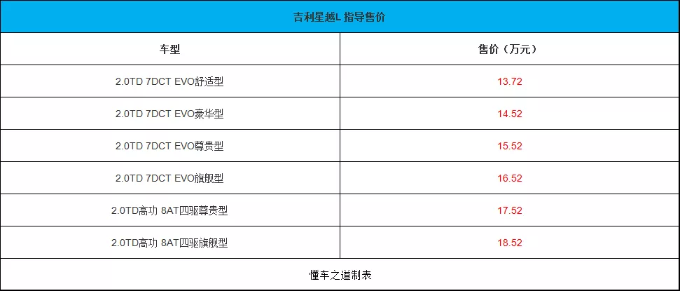 7月20日,吉利旗下全新紧凑型SUV——星越L车型正式上市。新车共推出6款配置,售价区间为13.72-18.52万元。新车是吉利品牌CMA高端架构下的最新产品,定位为一款大五座紧凑型SUV, 动力方面,两驱车型采用低功率发动机,最大功率218马力,最大扭矩325牛·米,配合7挡湿式双离合变速箱,官方加速时间为7.9秒;四驱车型搭配高功率发动机,最大238马力,最大扭矩350牛·米,变速箱为8AT,官方加速时间为7.7秒。