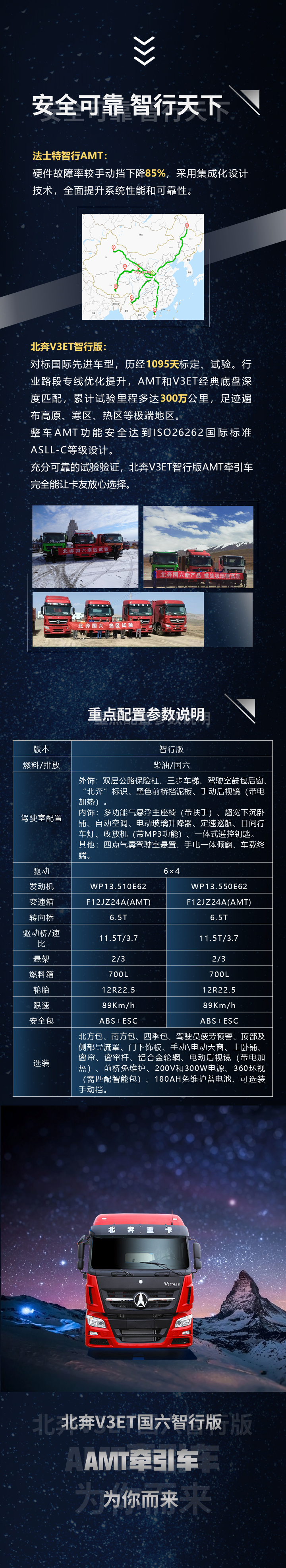 据北奔重汽7月24日官微消息,北奔V3ET国六智行版AMT牵引车震撼发布。该车搭载潍柴WP13.510E62或WP13.550E62马力经典发动机,采用法士特智行AMT变速箱;驾驶室配置方面,多功能气悬浮座椅、超宽下沉卧铺、自动空调、定速巡航、收放机、一体化遥控钥匙等一应俱全。