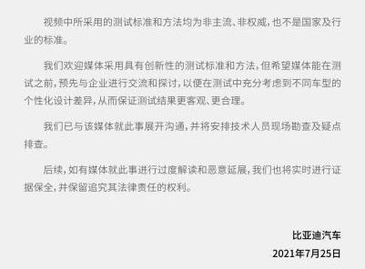 同时,比亚迪指出,测评媒体所使用的测试标准和方法均为非主流、非权威且不符合国家及行业的标准,因此也将与媒体就此事展开沟通,并安排技术人员现场勘察及疑点排查。