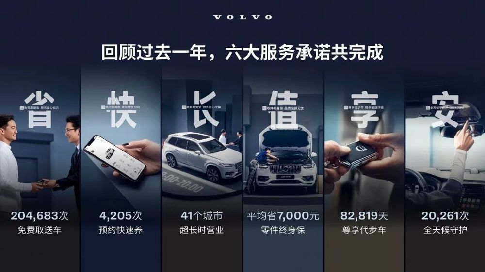 沃尔沃“六大服务承诺”发布至今已有一年时间,在这一年中,除去预约快速养、免费取送车以及零件终身保,沃尔沃完成了 “超长时营业 ”41个城市、“VOC救援”20261次、“代步车服务”82819天。这些数据的背后,体现出了沃尔沃竭力为所有车主提供“以人为本”服务的不变初心。