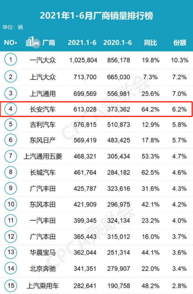 这样强势的增长,也让长安汽车的销量再度超越吉利、东风日产和两田,跃居厂商销量榜第四位,并再度问鼎中国汽车品牌销冠。