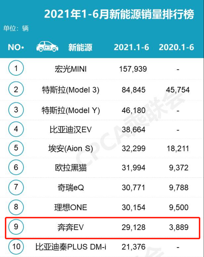 而在新能源板块,长安奔奔EV也进入了上半年销量前10,销量实现了649%的同比增长。