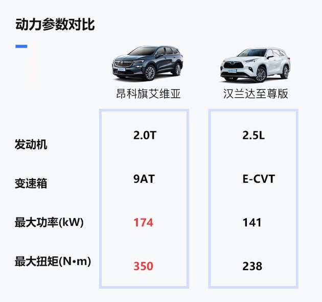 汉兰达搭载是2.5L自然吸气发动机+双电机组成的混动系统,其中2.5L发动机,最大功率为141kW,最大扭矩为238N·m,传动系统部分则匹配了E-CVT变速箱。单纯从发动机参数对比,昂科旗占有优势。但是由于汉兰达混动车型增加了双电机,系统综合功率达到183kW,也非常出色。另外昂科旗和汉兰达均提供两驱和四驱车型,其中昂科旗四驱车型采用的是适时四驱系统,带有多片离合器的中央差速器。而汉兰达则为电动四驱形式,结构相对简单一些。