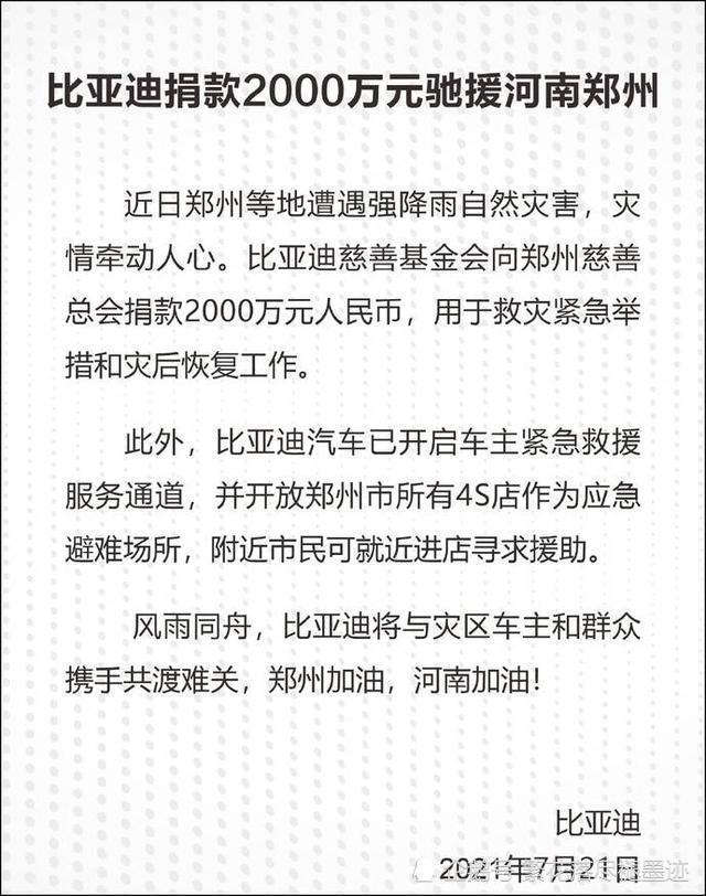 比亚迪慈善基金会向郑州慈善总会捐款2000万元人民币,用于救灾紧急举措和灾后恢复工作。此外,比亚迪汽车已开启车主紧急救援服务通道,并开放郑州市所有4S店作为应急避难场所,附近市民可就近进店寻求援助。”