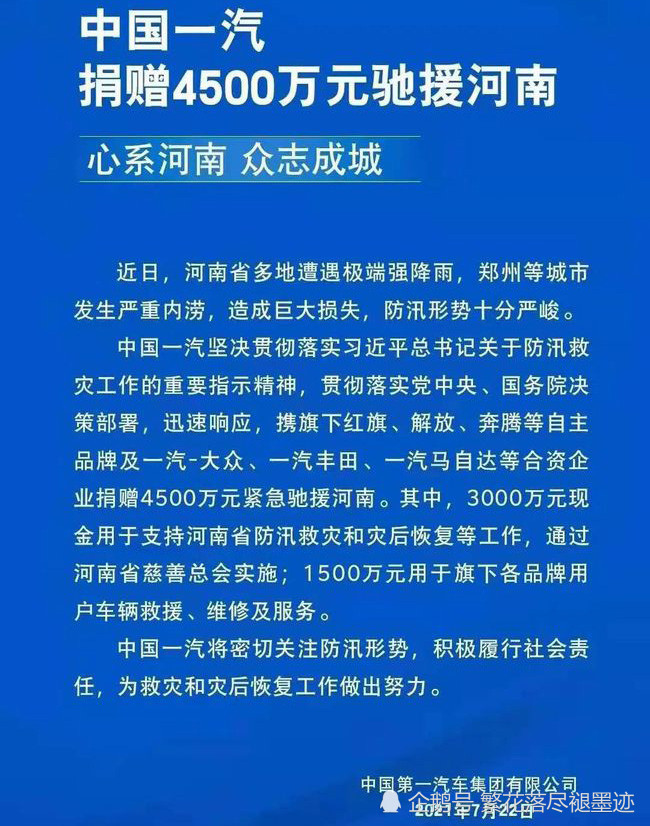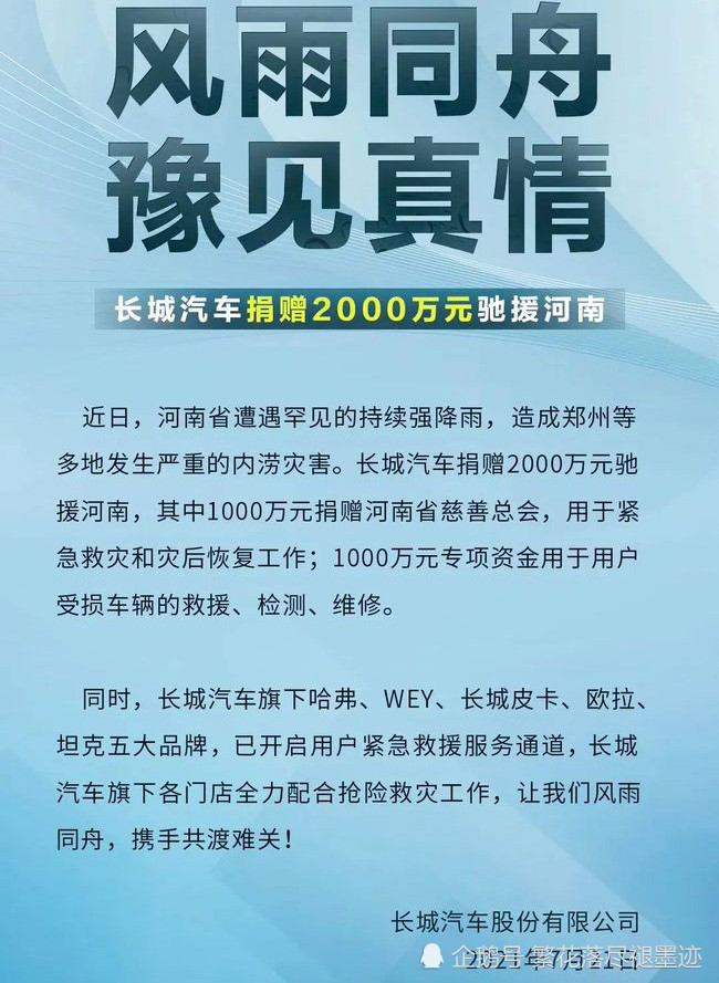 作为国产一哥,吉利汽车捐赠3000万元,其中现金2500万元,其余500万用于购买救援设备支援河南。要知道在去年疫情的时候,吉利捐款金额高达2个亿啊!这样的车企值得点赞!