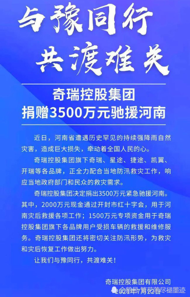 奇瑞控股集团捐款3500万元紧急驰援河南,其中2000万元通过开封红十字会,用于河南灾后救援各项工作,1500万元专项资金用于奇瑞控股集团旗下各品牌用户受损车辆救援和维修服务。奇瑞汽车2020年全年总销量为44万辆,纯利润约:737万,要知道奇瑞汽车负债约693亿,但是面对河南灾情,奇瑞汽车依然支援3500万,这相当于奇瑞汽车5年的利润啊!