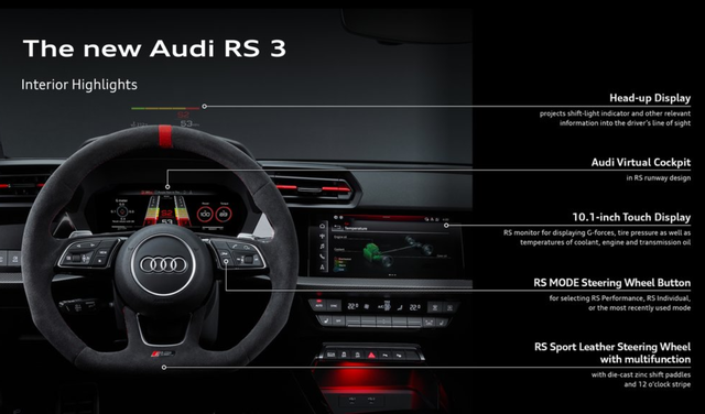 车内部分,全新奥迪 RS 3整体布局和A3基本保持一致,融入了更多的Alcantara材质进行包裹,部分车型的面板会采用碳纤维材质,RS运动座椅上会有RS标识以及独特的对比色缝线以彰显其独特身份。