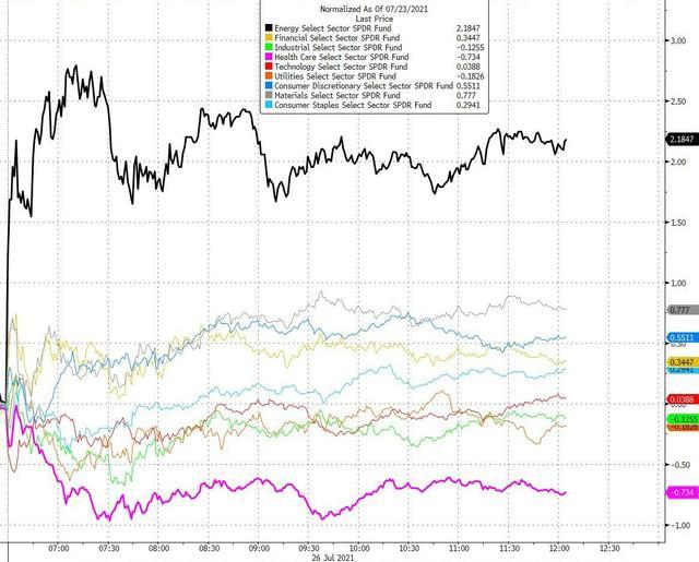 标普500的11大板块中,涨超2%的能源领涨,遥遥领先其他板块,涨幅第二位的材料涨近0.9%,信息技术微幅收跌,公用事业和工业几乎收平,房地产收平,医疗健康跌逾0.6%表现最差。