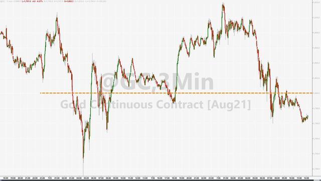 上周五创两周新低后,纽约黄金期货继续下挫。COMEX 8月黄金期货在欧股早盘曾涨至1812美元日内涨近0.6%,美股盘前转跌,最终收跌0.1%,报1799.20美元/盎司,自7月6日以来首次收盘跌破1800美元关口。上周五结束两日连涨的纽约白银和铂金期货反弹,分别收涨0.3%和0.8%,钯金收涨0.6%,终结五日连跌。