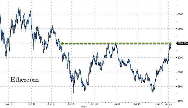 市值仅次于比特币的第二大加密货币以太坊(ETH)在周一美股午盘涨破2430美元,创6月16日以来盘中新高,较亚市早盘的日内低位涨近13%,美股尾盘也闪跌,迅速跌破2400美元,美股收盘时处于2330美元下方,24小时涨约8%。