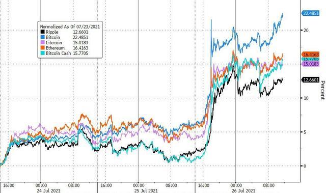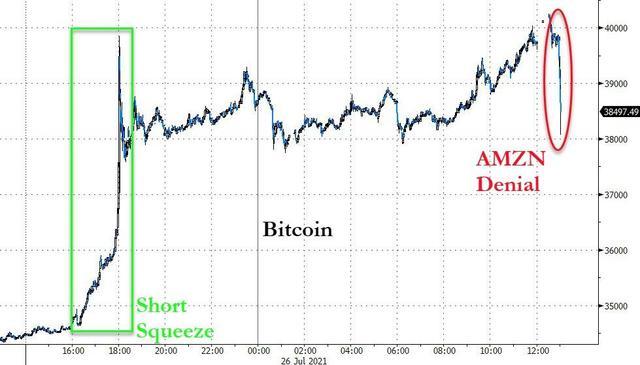 周末升破3.4万美元后,比特币(BTC)周一进一步走高,美股午盘涨破4万美元,6月15日以来首次突破这一关口,日内最高涨破4.05万美元,较日内低位涨超6000美元,百分比涨幅超过18%,亚马逊否认媒体报道后,美股临收盘时瞬间跳水,短短20分钟左右,从逼近4万美元水平跌破3.9万美元,收盘时处于3.9万美元下方,最近24小时涨幅收窄到13%以内,收盘不到半小时后跌破3.8万美元。