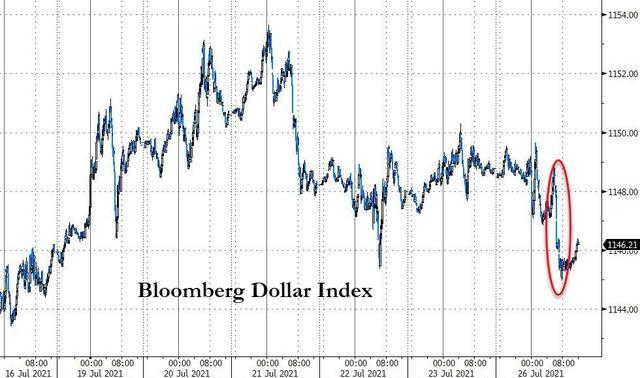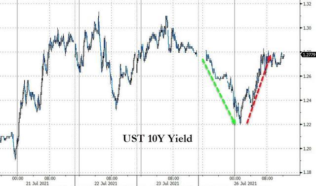 美国10年期基准国债收益率在欧股盘中曾逼近1.22%,创7月21日上周三以来盘中新低,日内降幅超过6个基点,此后回升,美股早盘重上1.28%,午盘抹平所有降幅转升,到美股收盘时约为1.29%,日内升逾1个基点。