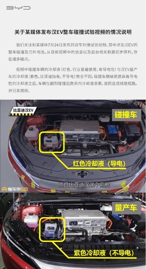 比亚迪汽车方面第一时间在官微做出回应,认为视频中所采用的测试标准和方法非主流、非权威,也不是国家及行业标准,内容也存在诸多疑点,例如比亚迪提到,碰撞车辆的冷却液(红色)与汉 EV 量产车的冷却液(紫色,比亚迪独有)完全不同,碰撞车辆被更换具有导电性的冷却液后,车辆在剧烈碰撞后数天内冷却液泄露,进而造成线路短路,并引发燃烧。比亚迪还称,将安排技术人员现场勘查及疑点排查。
