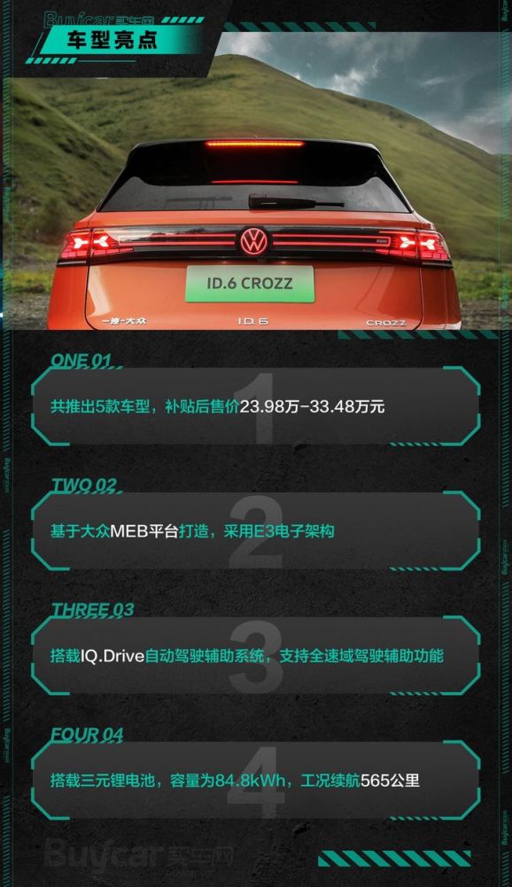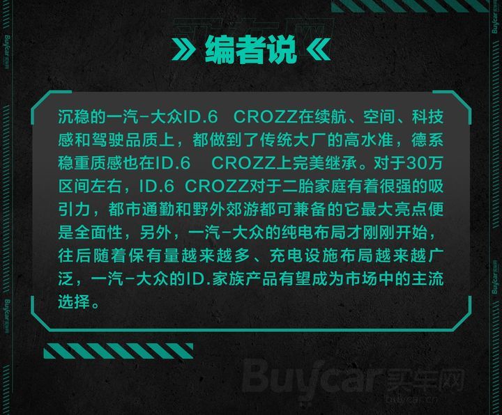 大众的纯电ID.家族便是最好的例子,从ID.4上我们便能看出大众对纯电车的态度,舒适、安全、稳定是ID.4的关键词。如今,ID.6已来,作为30万级传统车企纯电布局的排头兵,消费者们对这台车的关注度非常高,一汽-大众ID.6 CROZZ开起来如何呢?一起跟随买车网Buycar来看看吧!