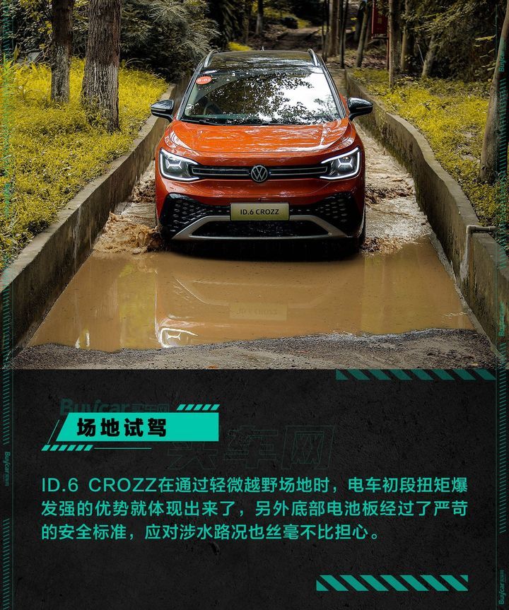当然了,ID.6 CROZZ主要用车环境多为城市路况,厂家安排了越野的科目主要是想向潜在消费者传播,ID.家族的电动车是可以兼顾野外轻越野环境的,也是强调ID.试图打造的生活是全场景的。