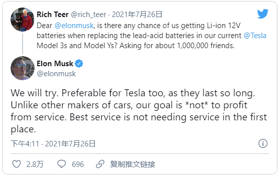 马斯克在回应中表示,特斯拉会尝试推出这样的计划,因为它对特斯拉车主有利,而且12 伏锂离子电池的使用寿命比传统铅酸电池长得多,据马斯克称,特斯拉的目标是不从服务中获利,最好的服务就是不需要服务”。