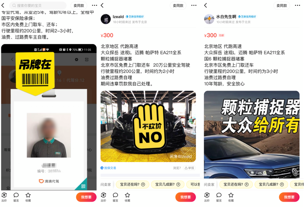 由此才催生了闲鱼上“代大众车主跑高速”这一业务。不少代理者声称,无论晚上或周末均可服务、可上门取车还车、服务期间产生任何违章罚款由代理者承担等等。