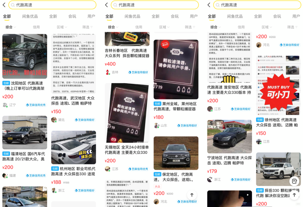 但近几日小编发现一件更让人啼笑皆非的事。某二手交易平台惊现替大众车主跑高速业务,且该业务涉及广泛,遍布全国各个城市,价位也从150至500元不等,甚至有的还能讲价。