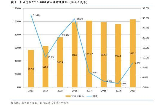 2017年长城汽车营收1011.7亿元;2018年为994.69亿元;2019年为964.55亿元。2020年再破千亿,达到1033.08亿元。