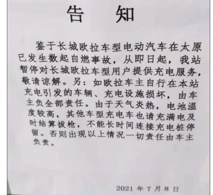 7月初,山西太原的一些充电站把欧拉iQ拉入黑名单。原因是近期连续发生多起欧拉iQ充电自燃情况。