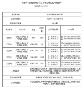2021年7月16日,长城汽车向国家市场监督管理总局备案召回计划。自2021年7月16日起,召回2018年7月7日至2019年10月30日期间生产的长城欧拉IQ电动汽车,共计16216辆。召回原因是:车辆搭载的部分动力电池的一致性与BMS软件控制策略存在匹配差异。长期连续频繁快充后,电池性能下降,极端情况下可能发生动力电池热失控,存在安全隐患。