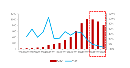 2010年起,国内SUV销量持续攀升,长城汽车也尽享市场红利,2014年-2016年,SUV销量由51.9万辆增长至93.3万辆。然从2016年到2020年,拥有哈弗和WEY的长城汽车,SUV总销量下滑约13%。