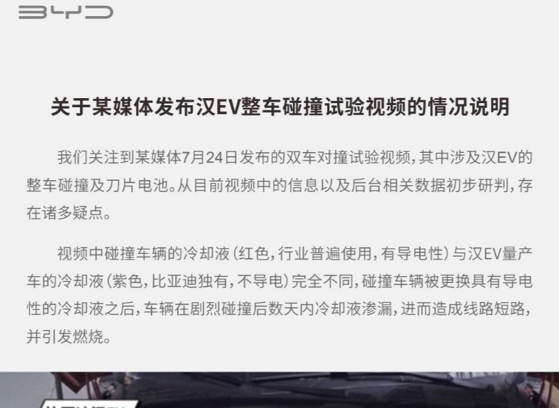 本月24日,某汽车媒体进行碰撞测试,其中包括比亚迪汉EV,而在对撞测试48小时后,比亚迪汉EV在静置时发生了自燃。一时间比亚迪汉EV瞬间站在舆论的风口浪尖,其安全性也被诸多消费者质疑。