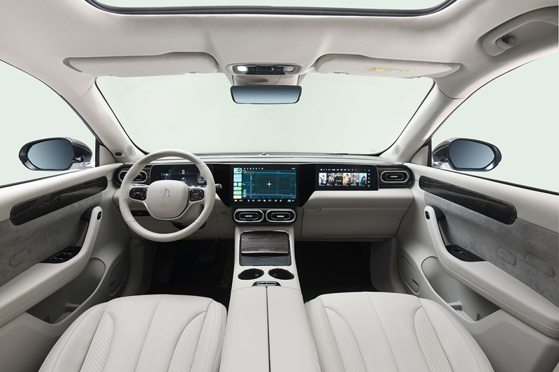 内饰部分,该车整体以米白色为主,在部分区域还采用了木纹装饰,中控台采用了“T”字型设计,配备了三联屏设计,凸显出一定的科技属性,液晶仪表、中控屏幕和副驾驶娱乐屏幕尺寸分别为10.25、12.8和10.25英寸。