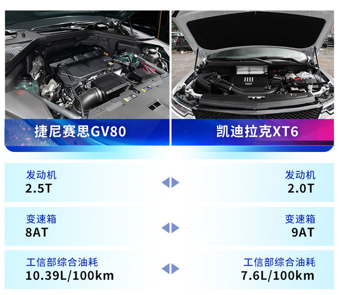 动力系统对于一款车型是十分重要的,GV80采用代号为G4KR的2.5T发动机+8速手自一体变速箱的组合,并配有四驱系统,工信部综合油耗10.39L/100km。XT6采用代号为LXH的2.0T发动机+9速手自一体变速箱组合,并配有四驱系统,工信部综合油耗7.6L/100km。