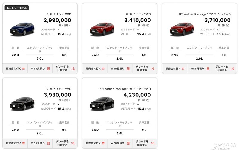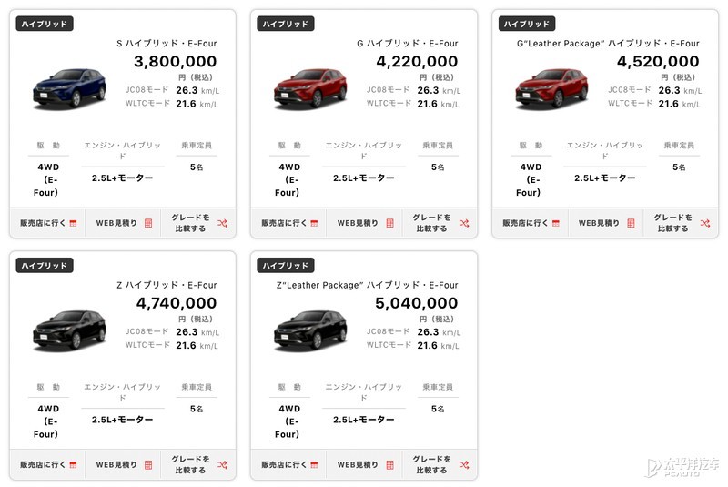 在日本市场,Harrier提供2.0L自然吸气和2.5L混合动力两种动力总成,并且提供了两驱以及四驱版,高达10个车型供消费者选择。其中2.0L两驱版的售价区间为日元299万-423万円(折合人民币17.69-25.02万元),2.0L四驱版的售价区间为319万-443万円(折合人民币18.87-26.20万元);2.5L混动两驱版售价区间为358万-482万円(折合人民币21.17-28.51万元),2.5L混动四驱版售价区间为380万-504万円(折合人民币22.48-29.81万元),因此Harrier在日本售价区间约合人民币为17.69-29.81万元。
