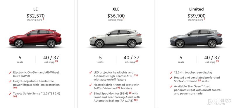 而美规车型Venza则简化很多,共推出LE、XLE、Limited三个配置,由于北美买家对动力的有较高要求,因此全系车型毫不墨迹地提供2.5L混合动力系统+四轮驱动,售价区间从32570-39900美元(折合人民币21.17-25.4万元)。