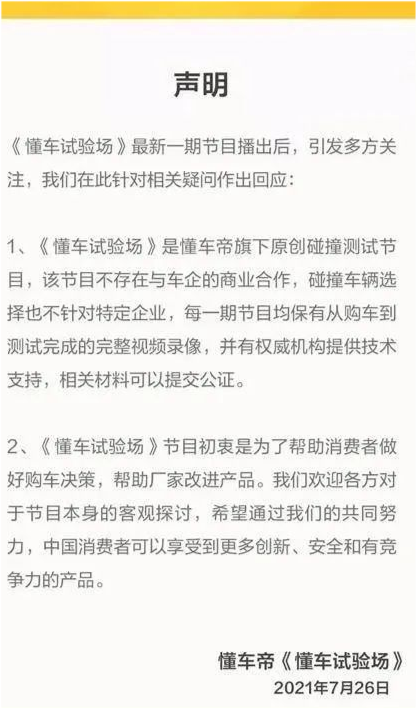 针对诸多猜测,懂车帝在7月26日下午发布一则简明扼要的声明,大致意思是: