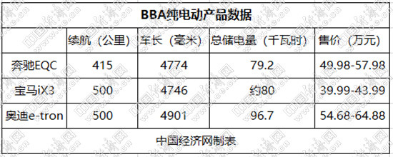 为了改变市场低迷的表现,BBA在电动车市场采取价格下探的策略。今年1月27日,宝马官方发布声明称,iX3的建议零售价下调7万元。中国经济网记者近期在走访时了解到,目前宝马iX 3现金优惠达到5万元;此外,奔驰EQC厂家补贴6.9万元,4S店补贴6万元;奥迪国产e-tron优惠幅度为八五折。