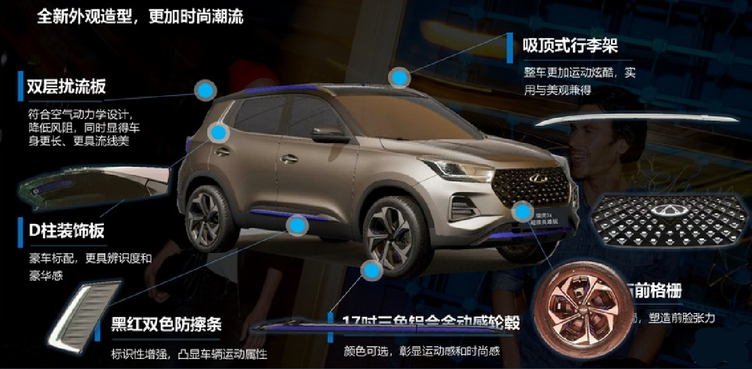 并且,该车还新增了双层扰流板,吸顶式行李架,C柱装饰板,黑红双色的防擦条等,从而进一步地提升了整体的潮流气息。至于内饰方面,瑞虎5x超级英雄版布局非常的清晰且简洁,悬浮式的液晶显示屏,将集成诸多实用功能于一体,提升了整体的科技感,大量镀铬元素的运用,从而使其整体看上去非常的具有档次感。