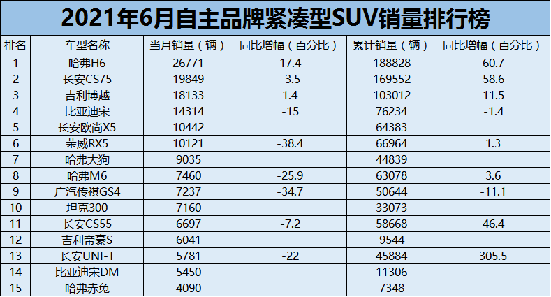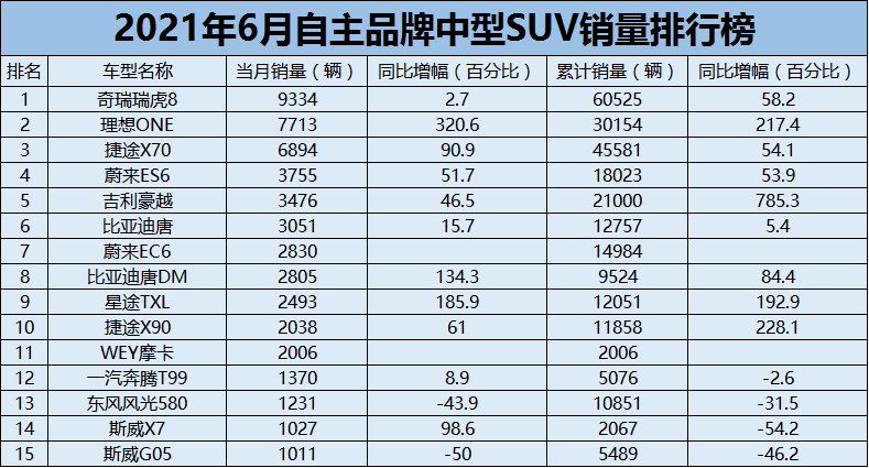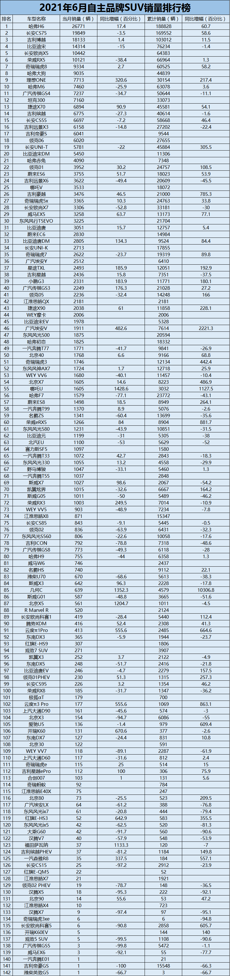 乘联会数据显示,今年6月,中国品牌SUV销量达到33.6万辆,同比增长1.8%,今年上半年累计销量达到215.7万辆,同比增长28.6%,市场份额接近SUV总销量的一半。