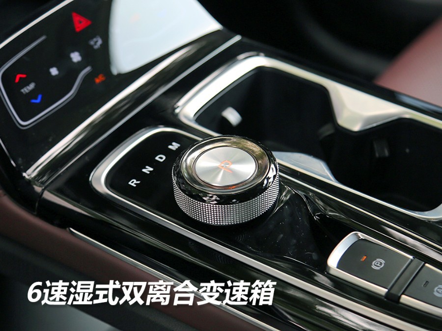 变速箱方面,它使用了一台6速湿式双离合变速箱,并采用了旋钮的换挡方式,这样的换挡方式和很多新能源车相似,挂入P挡时,按下中间的银色按键就可以了,操作很轻松。