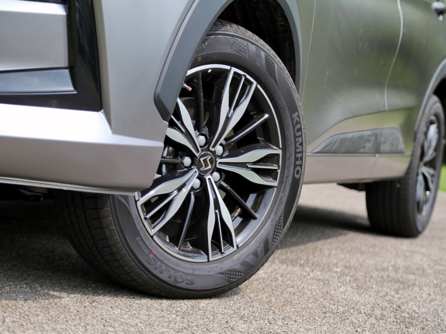 我们拿到的这辆试驾车,配备了一款多辐条的18英寸双色轮圈,搭配了来自锦湖的SOLUS HS63系列轮胎,该系列轮胎比较注重附着力和耐磨性的表现,属于是典型的城市型轮胎。