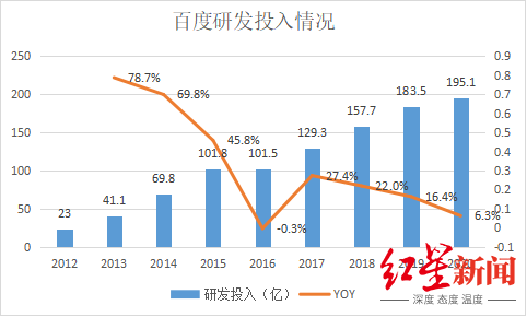 根据百度财报显示,2013年至2015年百度的研发投入持续增加,2013~2015年研发投入YOY分别为78.7%、69.8%、45.8%;2016年,百度的研发投入出现暂缓,但在2017年,百度的研发投入恢复到持续增长状态。