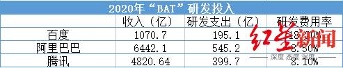 在2020年百度研发投入高达195.1亿,同比增长6.3%,虽然百度的研发费用绝对值尚不及阿里巴巴和腾讯,但研发费用率却远远超过了后两者。2020年,百度的研发费用率为18.2%,同年阿里巴巴和腾讯的研发费用率分别为8.5%、8.1%。