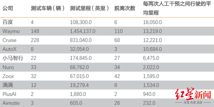 从无人驾驶的实际水平来看,百度在2019加州自动驾驶公司MPI排名第一。百度在加州只部署了4台自动驾驶测试车,2019年全年测试里程达到108300英里,而接管次数仅6次(每1.8万英里接管一次),超越自动驾驶企业Cruise与Waymo跃居榜首。