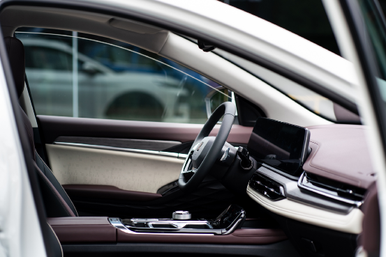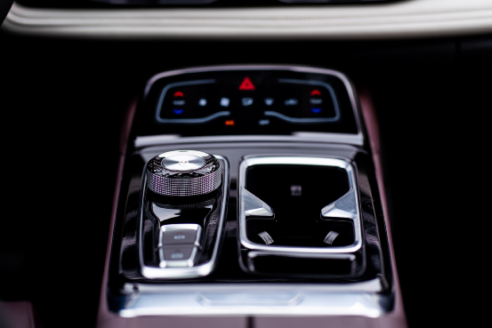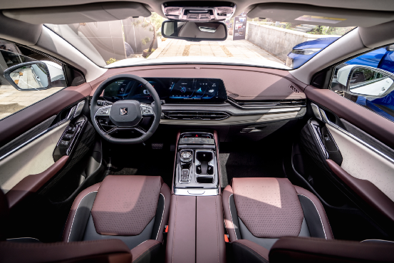 车内整体内饰走的是豪华路线。初次看到会给人眼前一亮的感觉。双12.3寸大屏、空调液晶触控屏、外加旋钮式换挡,以及大量的皮质和软性包裹,营造出足够的豪华、科技氛围。实际摸了一圈,除了方向盘稍微细了一点,内饰的用料和做工都比较厚道、扎实。