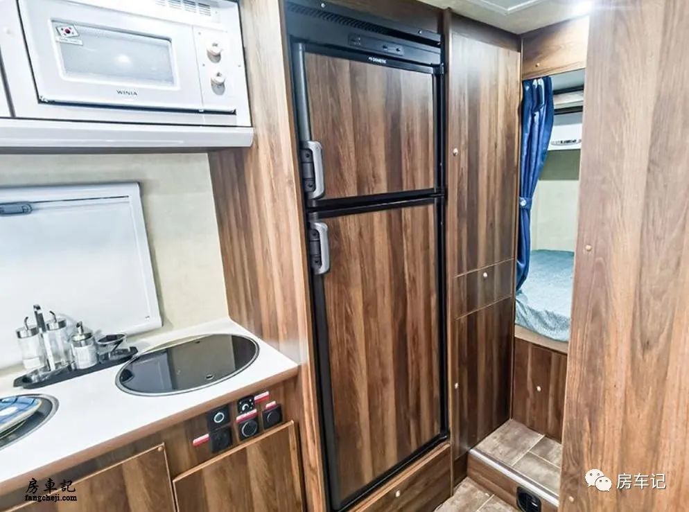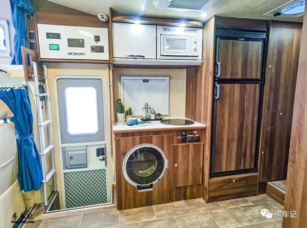 厨房区域的空间也非常宽敞,一个O型带盖的水槽,旁边有一个电磁炉,操作台下方是一个隐藏式的洗衣机,可以节省不小的空间,右边是储物柜。在上方配备了一个微波炉和一个吊柜,右边是一个容量为152L的双开门冰箱,可以储存很多的食材。