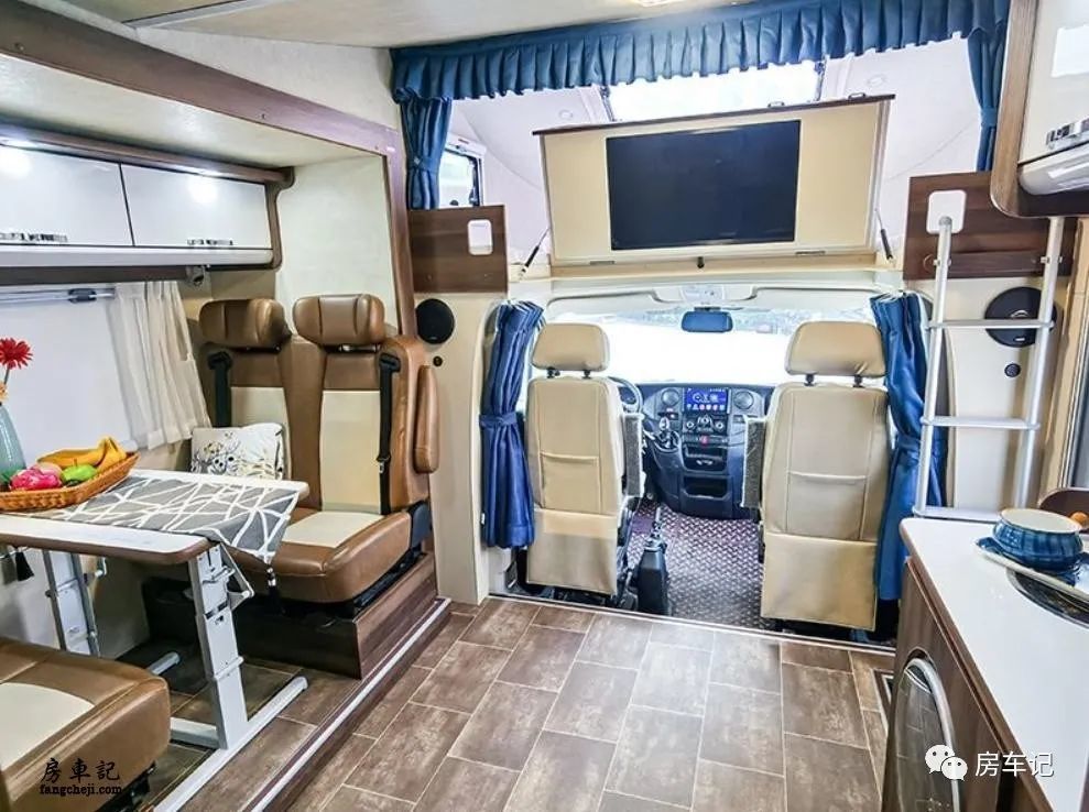 我们可以看到,在驾驶舱的上方有一个额头床的设计,额头床的尺寸是200cm*140cm,完全可以满足两个成年人的休息需求,尺寸还是比较大的。在不需要使用的时候或者行驶过程中,将床板翻折起来是一个32寸的安卓电视,可以满足娱乐需求。