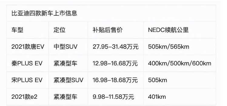 当然比亚迪也并非没有新成果,在去年它公布了最新刀片电池、DM-i超级混动技术,也受到了业界的广泛认可。而这对于比亚迪来说,也许是助力其销量重回当年霸主之位的利器。近日,比亚迪在重庆的大型发布会上,一口气上市了4款新车型:2021款唐EV、 秦PLUS EV、宋PLUS EV及2021款 e2四款纯电车型,值得一提的是,4款新车均使用了最新的刀片电池技术。