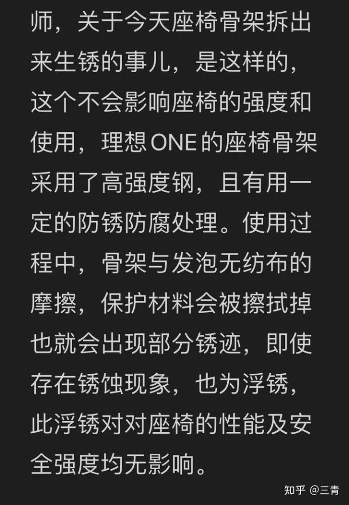 那么,这块锈迹是何时产生的?即便大部分主机厂对座椅防锈没有要求,理想ONE出现生锈就无伤大雅了吗?节目播出后,理想汽车也联系了知乎汽车,理想汽车保持了一惯的先甩锅的态度:“理想ONE的座椅骨架有一定的防锈防腐处理,在使用过程中,骨架和发泡无纺材料的摩擦,保护材料会被擦拭掉也就会出现部分锈迹。”